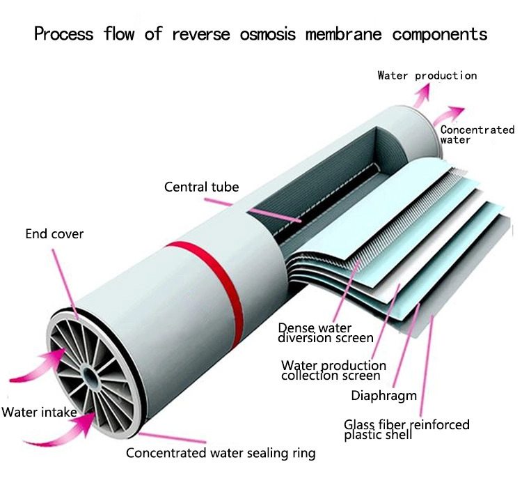 Re: omgekeerde osmosemembraan maakt gebruik van omgekeerde osmose en osmoseprincipe, wanneer de druk hoger is dan de toegepastenatuurlijke osmosedruk, zullen watermoleculen terugstromen door semi-Zaadfilms om zuiver water te scheiden.