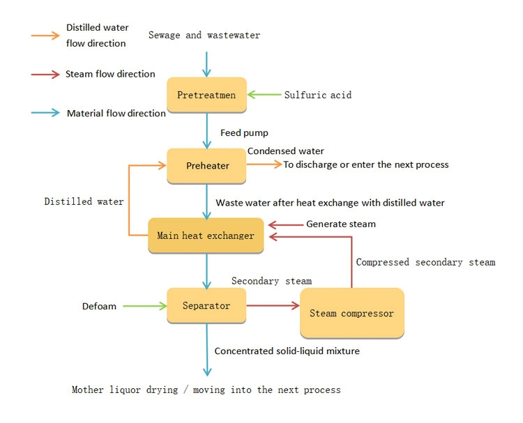 MVR anorganisch waterverdamper Gebruikt mechanische dampcompressie (MVR) technologie. Deze techniek comprimeerde de verdamper door compressor, breidde zijn temperatuur en druk uit en werd vervolgens toegepast op de verdamper om opnieuw te verdampen. Op deze manier kan de ene kant het energieverbruik tijdens de verdamper aanzienlijk verminderen, aan de andere kant kan ook de verdampingsefficiëntie verbeteren en de efficiënte anorganische waterbehandeling bereiken.